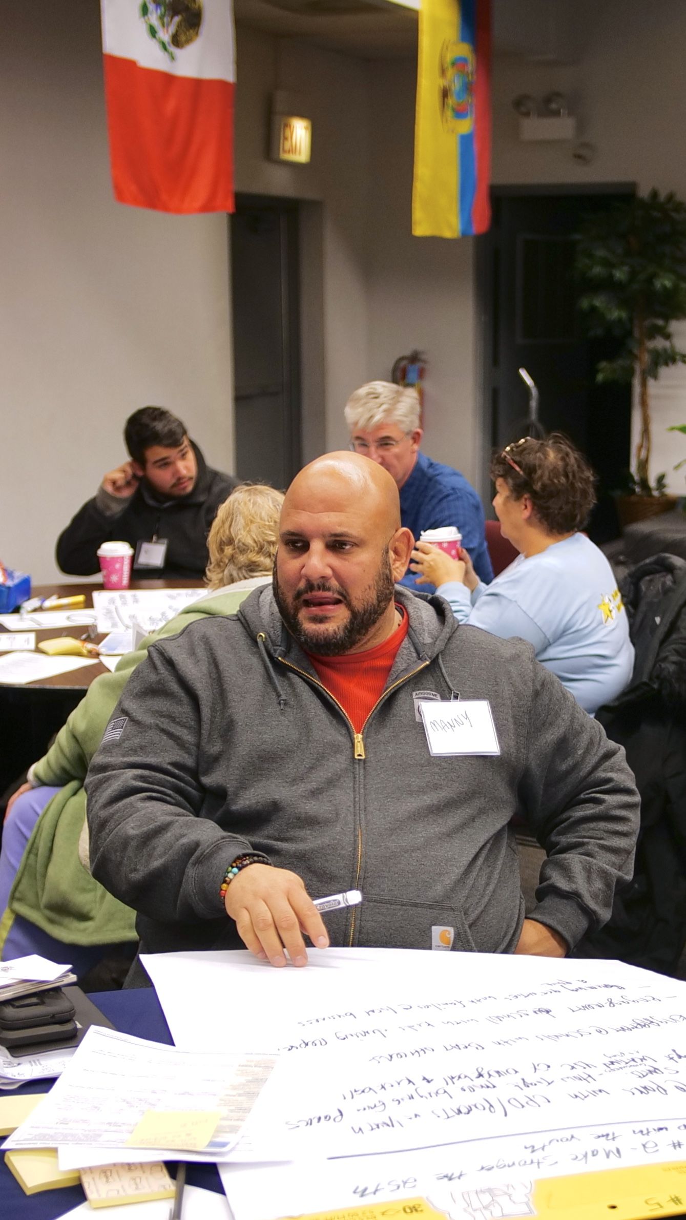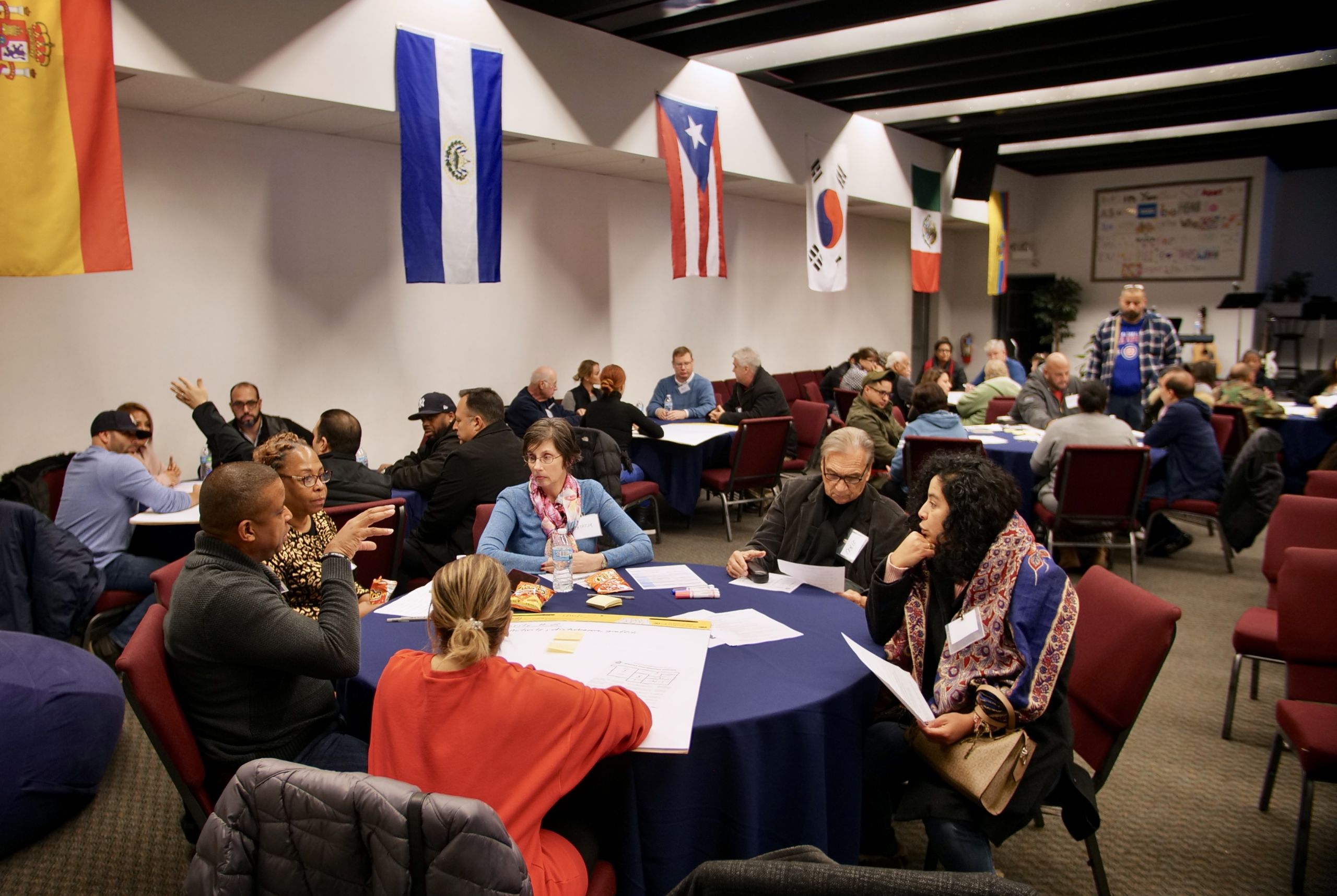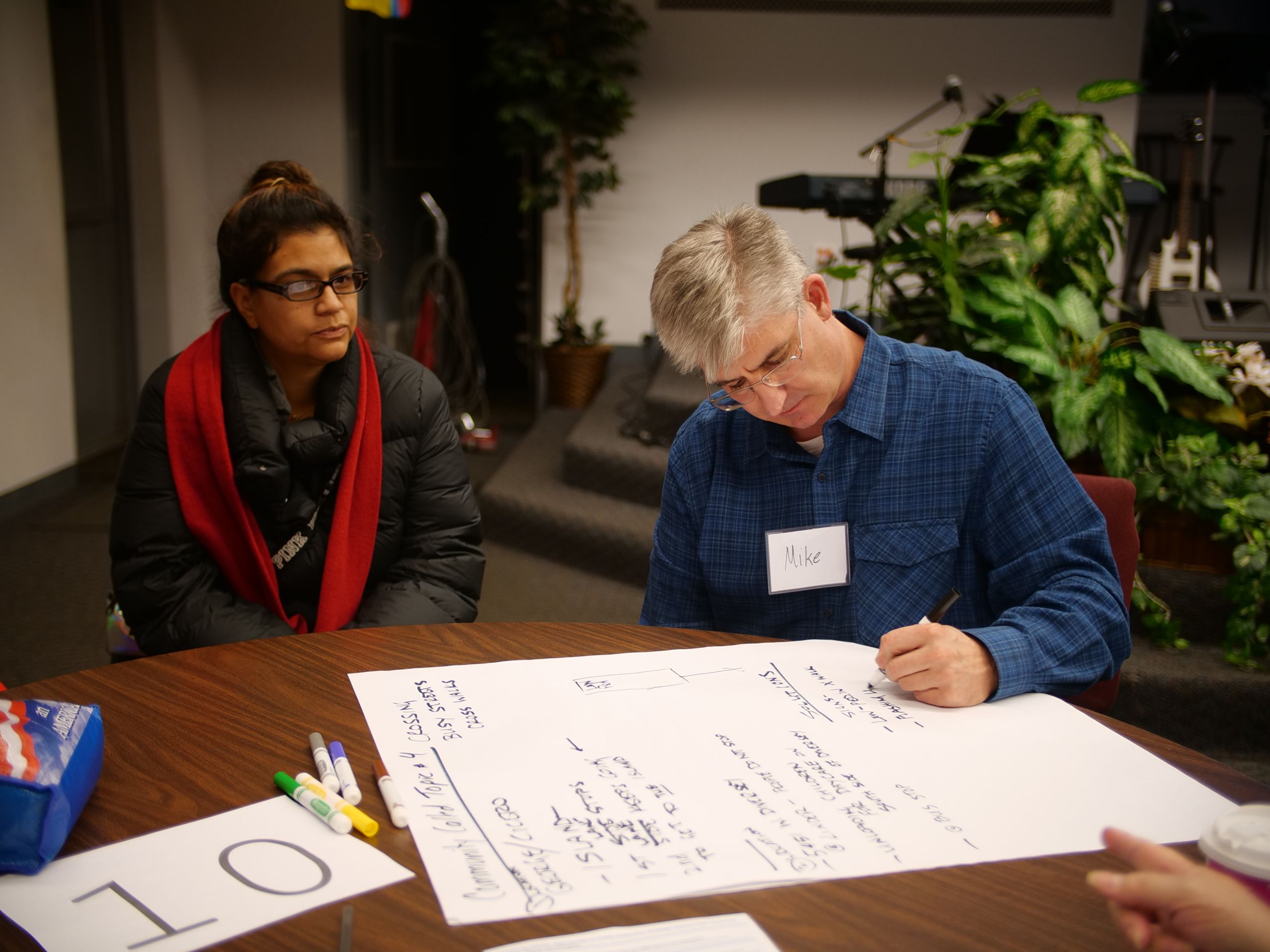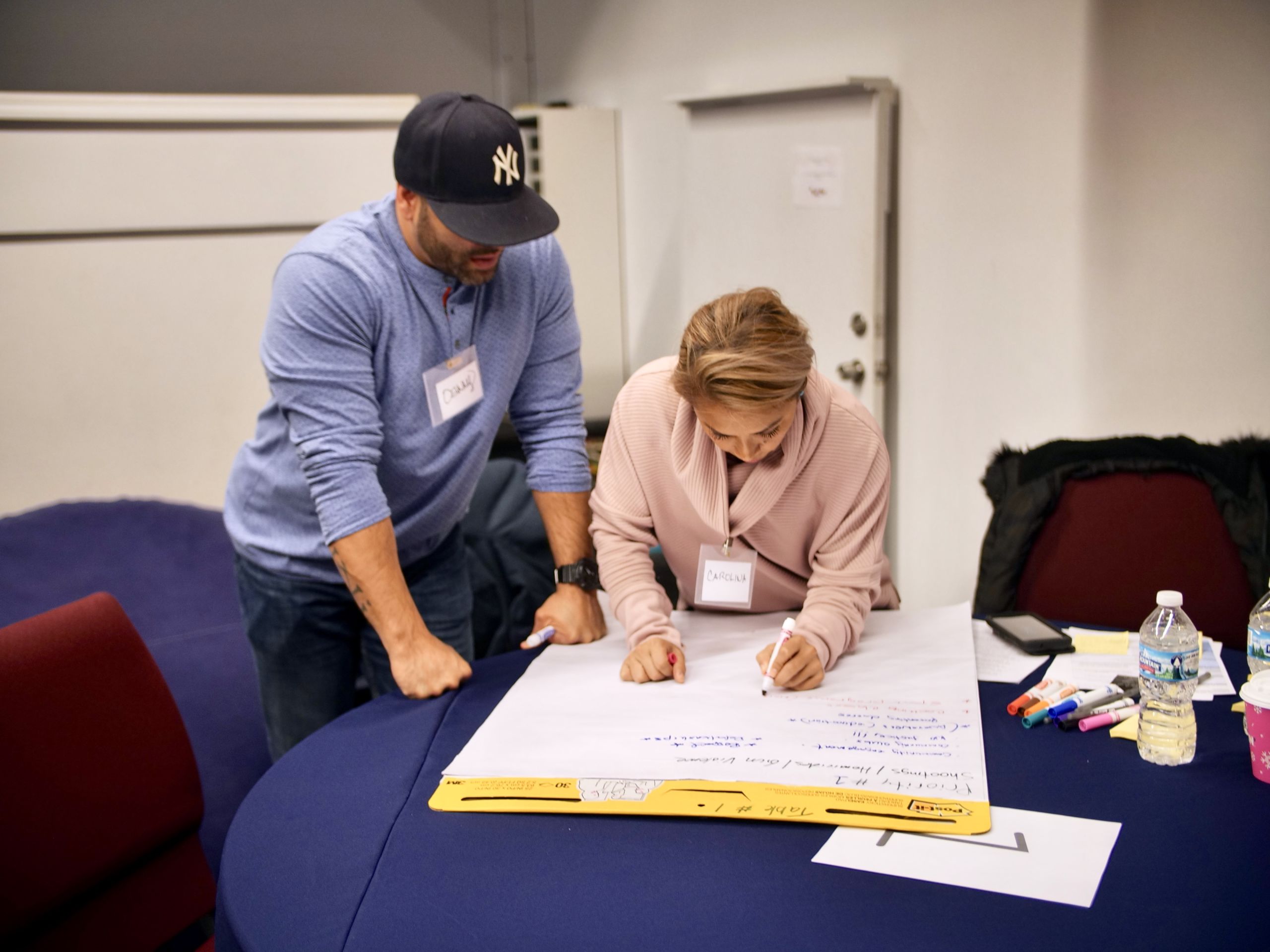 District Coordination Officers Danny Lopez and Carolina Salcedo listen to resident concerns about gang activity at an event hosted by the 25th District as part of its community policing efforts. (WBEZ/Katherine Nagasawa)