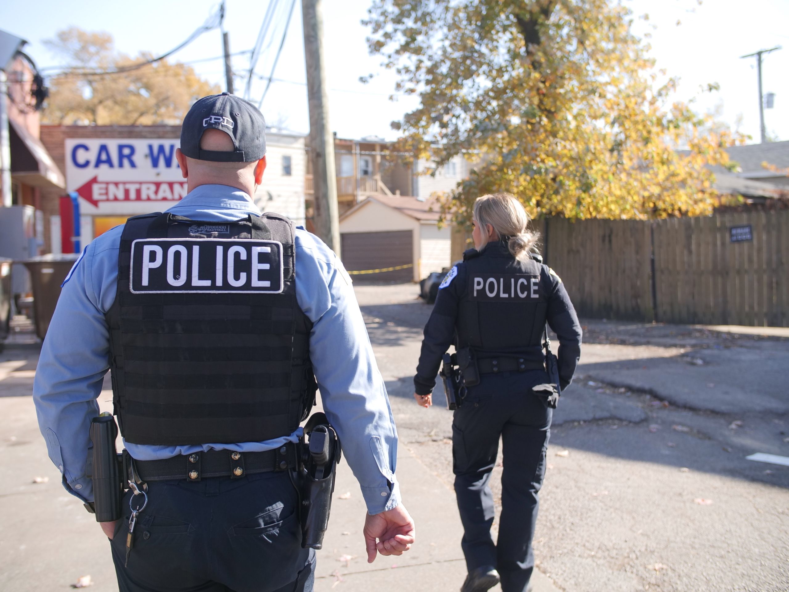 District Coordination Officers Danny Lopez and Carolina Salcedo head to a pawn shop after a robbery. The manager called Salcedo after she called 911 and was put on hold. (WBEZ/Katherine Nagasawa)